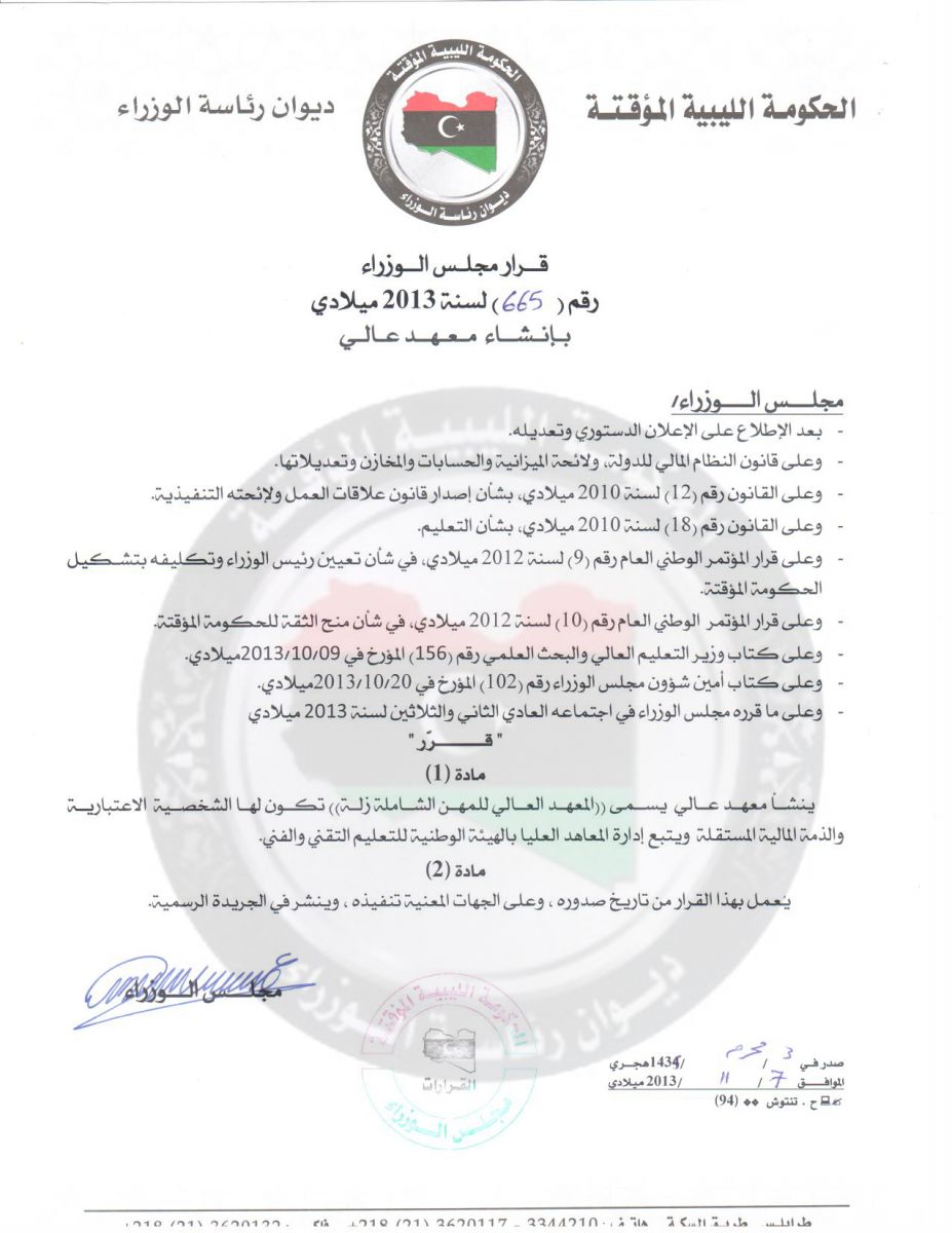 Government Decision 665 establishing a vocational centre in Zella.
