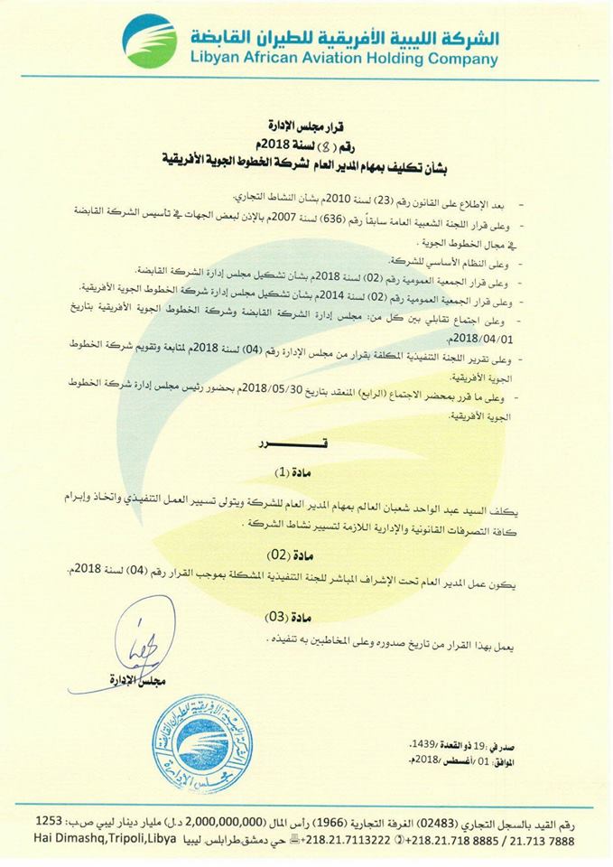 LAAHCO Decision 8 of 2018 appointing a new chairman to Afriqiyah Airways (Ar)
