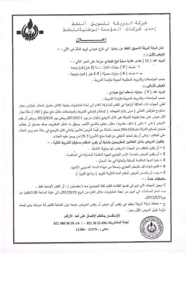 Brega is seeking to purchase 11 Hyundai cars plus 3 Hyundai ambulances. Local suppliers interested in participating are invited to collect specifications between 8 and 16 October from the company offices. Full details below: